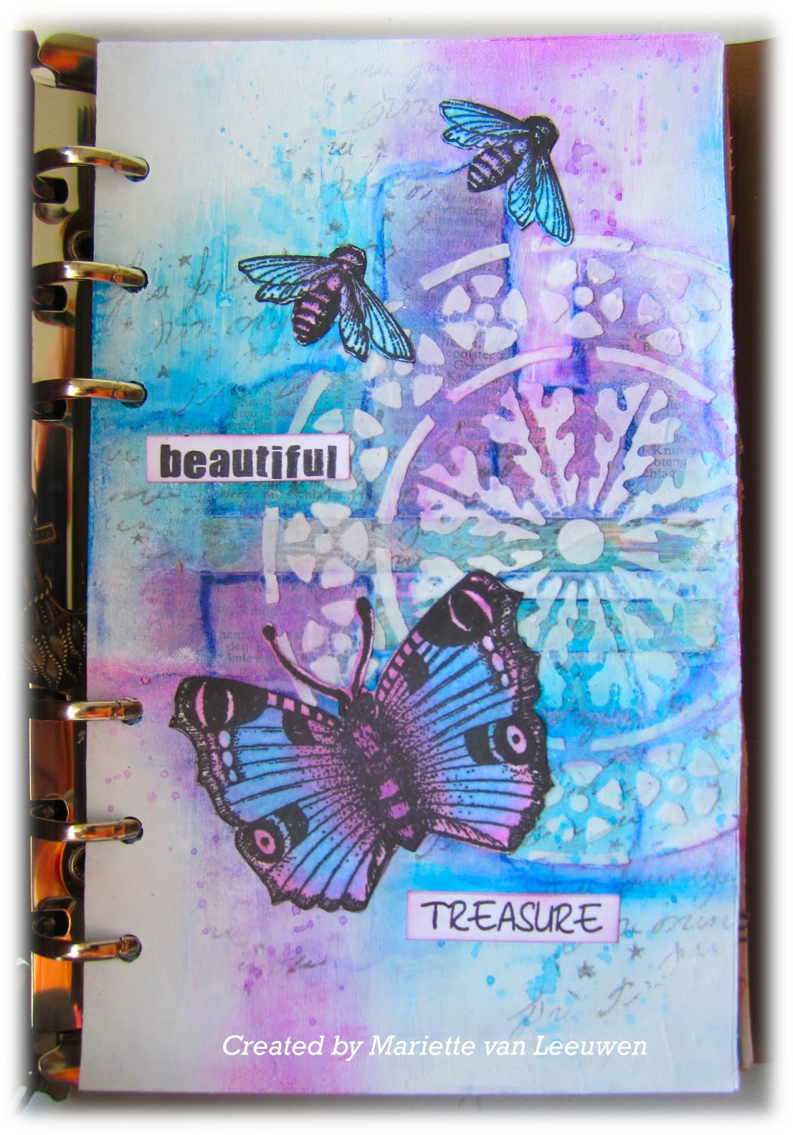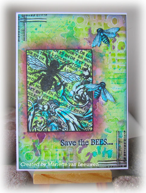Op het gekleurde achtergrond ben ik hier en daar gaan stempelen met achtergrond stempeltjes uit de ATC embelishments set van de Victorian Dream collectie. Ik heb gestempeld met de archival inkt black soot.