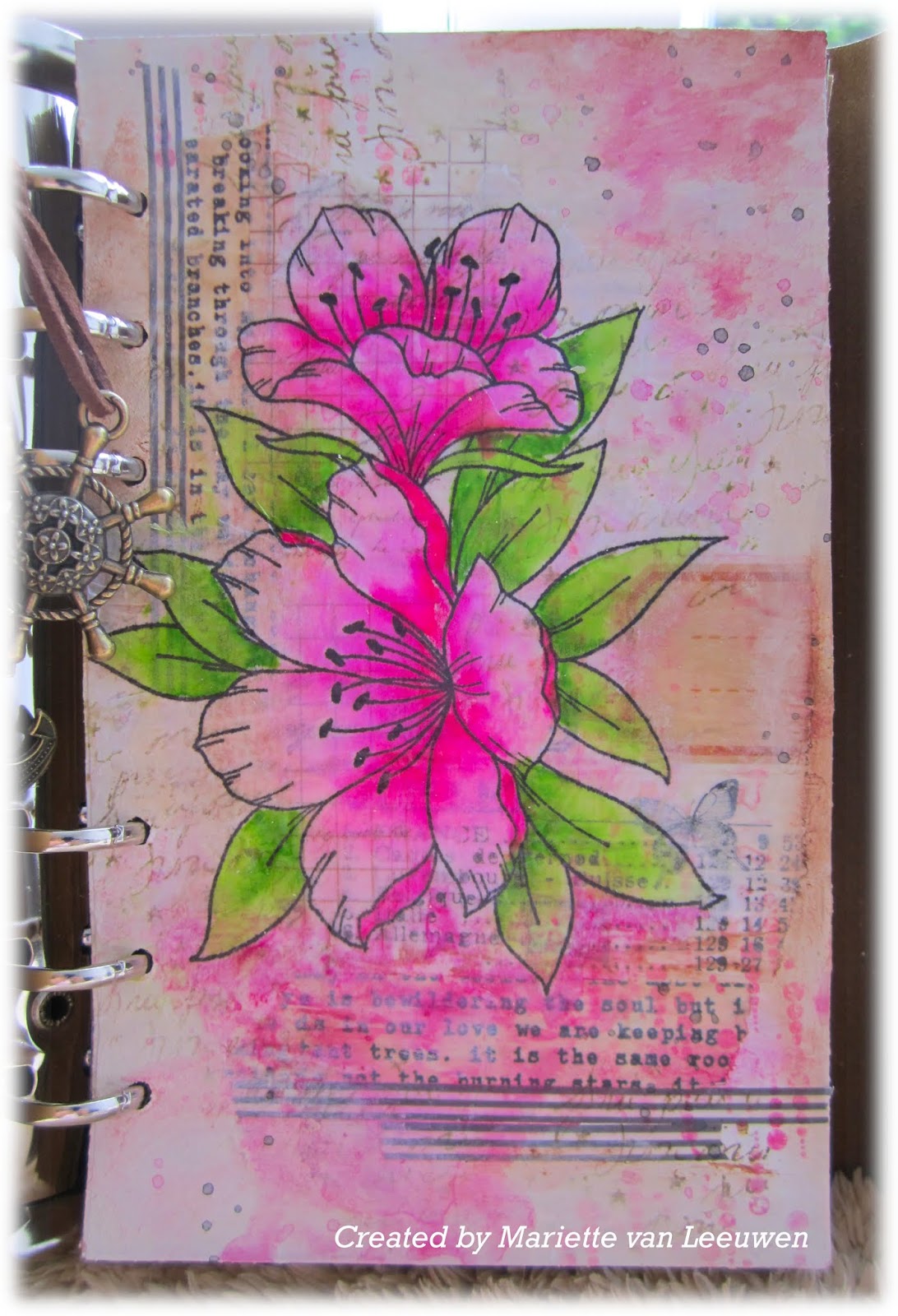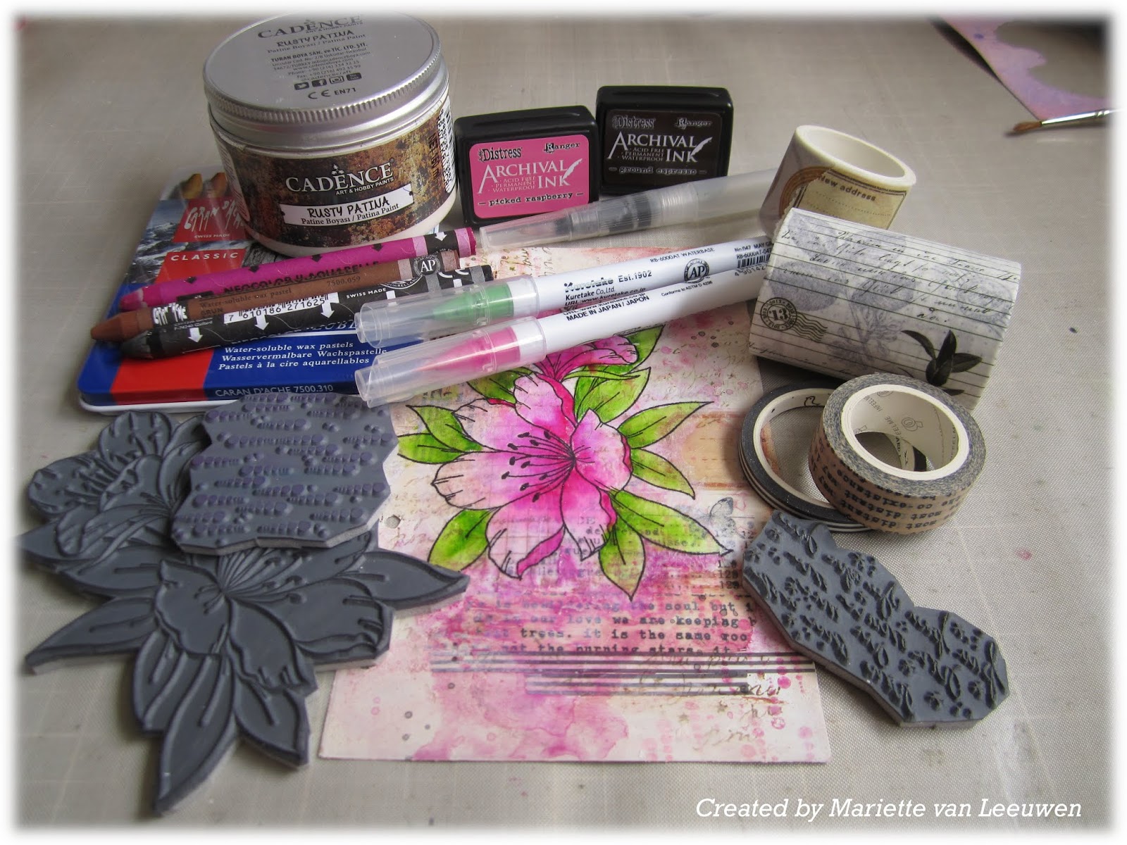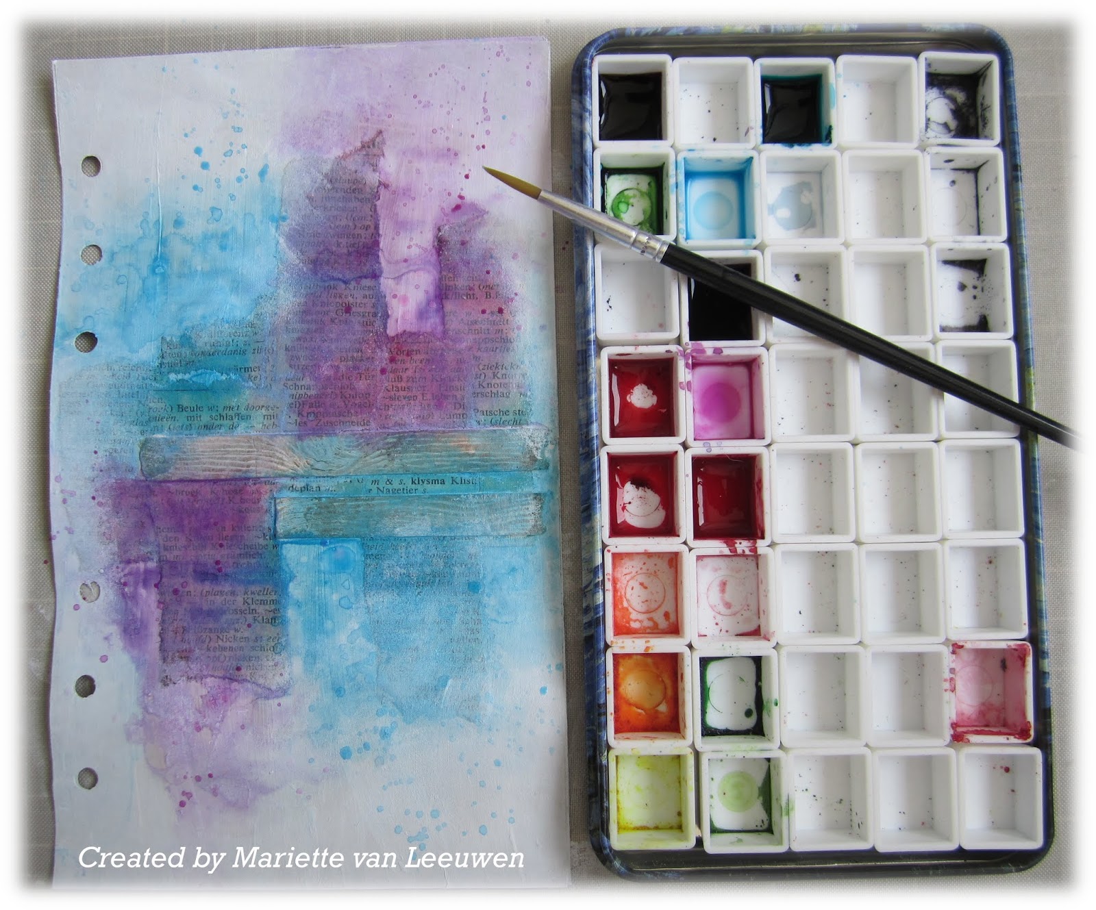 De basis is een stuk aquarelpapier met een formaat van 9 x 13 cm. Hierop heb ik een aantal kleuren JMA acrylverf aangebracht met behulp van een brayer. De kleuren die ik heb gebruikt zijn: almond bell, sepia bloom, vintage peony en olive grove.