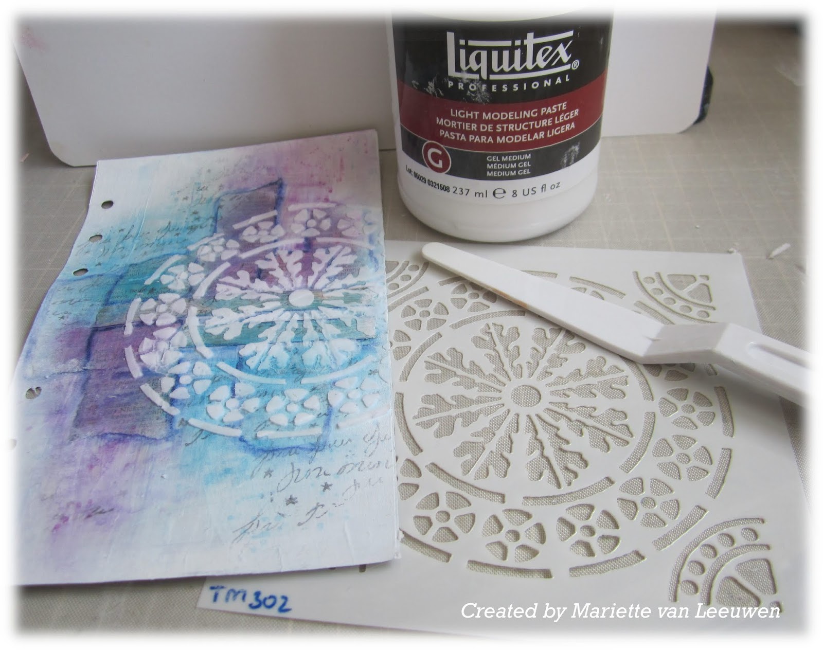 Daar ben ik aan de slag gegaan om met de JMA acrylic paints, stempels en stencils een A5 achtergrond te maken. Deze achtergrond kun je dan gaan gebruiken voor bv een ATC, kaart of embelishments.