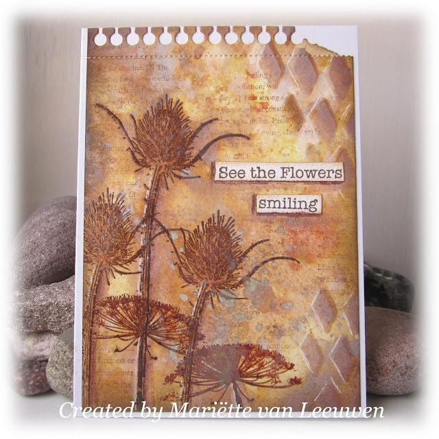 De bloemen zijn gestempeld met distress inkt en clear embossingpoeder heat embossed.