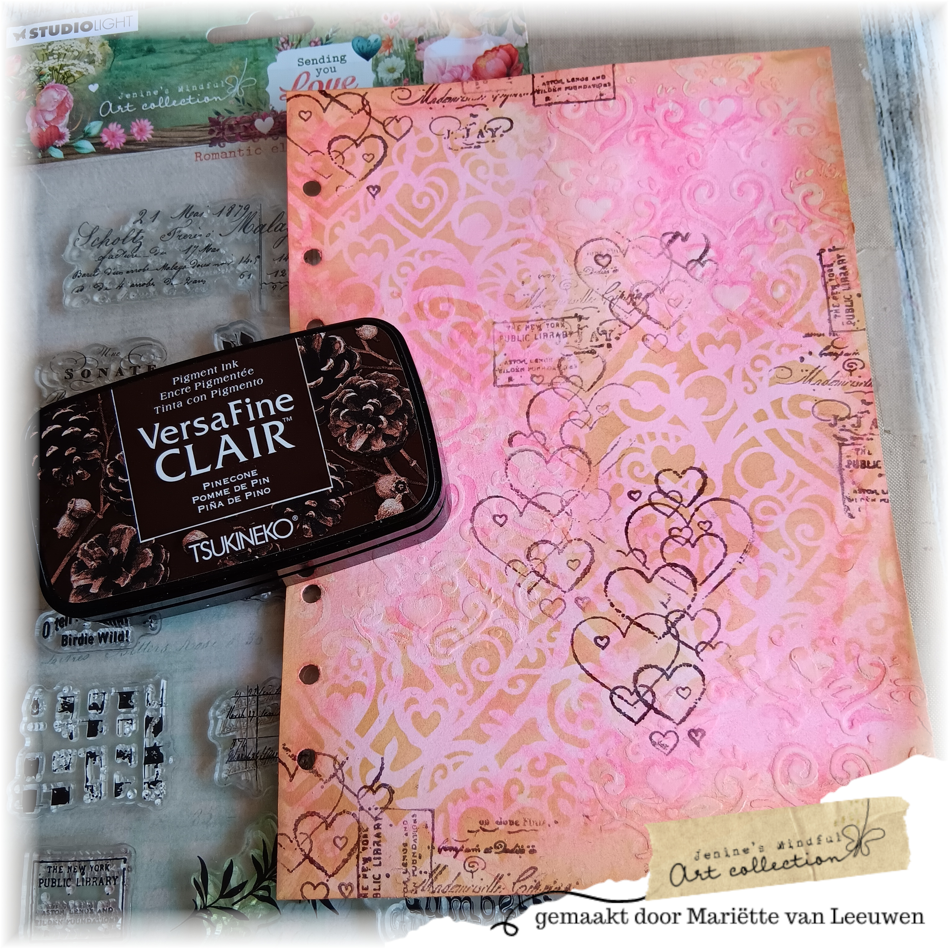 Hier en daar wat stempels uit de romantic elements set afgedrukt op de achtergrond met de versaclair pinecone inkt.